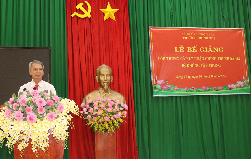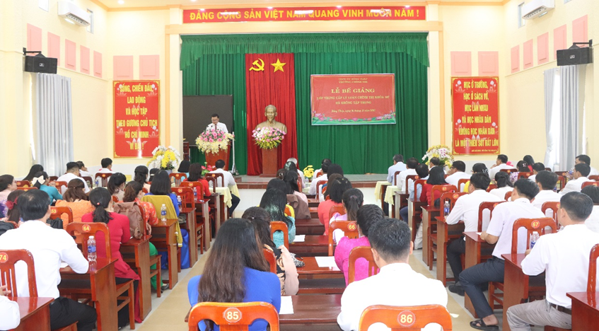 Phát biểu bế giảng lớp học, TS. Nguyễn Phước Dũng, Tỉnh uỷ viên, Bí thư Đảng uỷ, Hiệu trưởng Trường Chính trị Tỉnh chúc mừng kết quả học tập của 67 học viên; đồng thời biểu dương các đồng chí học viên đạt thành tích trong rèn luyện và các hoạt động phong trào. TS. Nguyễn Phước Dũng đánh giá cao tinh thần nghiêm túc, nỗ lực khắc phục khó khăn của các học viên. Đồng chí đề nghị các học viên của lớp cần vận dụng linh hoạt các kiến thức đã được cập nhật vào thực tiễn nhiệm vụ tại địa phương; tiếp tục rèn luyện, giữ gìn lý tưởng cách mạng, nâng cao nhận thức, bản lĩnh chính trị, tiên phong, gương mẫu, sáng tạo, hoàn thành tốt nhiệm vụ được giao. Đồng thời, tiếp tục phát huy tinh thần tự học, tự rèn luyện, nâng cao trình độ chuyên môn nghiệp vụ, năng lực tư duy trong giải quyết các vấn đề, tình huống phát sinh trong thực tiễn công việc một cách hiệu quả.