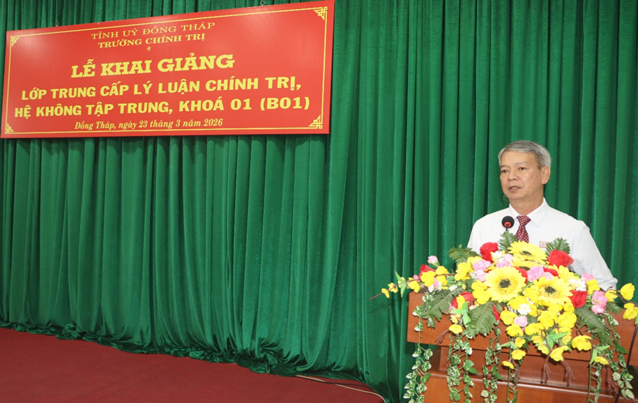 Sáng ngày 23/3/2026, Trường Chính trị tỉnh Đồng Tháp tổ chức Lễ khai giảng lớp Trung cấp lý luận chính trị, hệ không tập trung, khóa 01 (B01), theo Kế hoạch số 56-KH/TCT ngày 20/01/2026 về đào tạo, bồi dưỡng cán bộ, công chức, viên chức năm 2026.